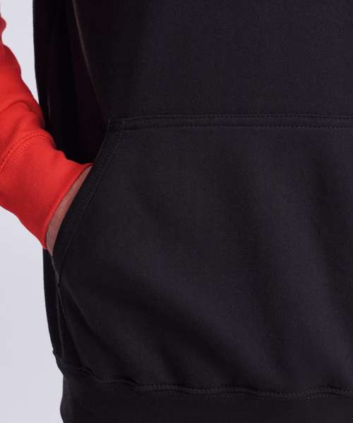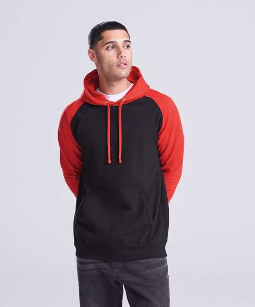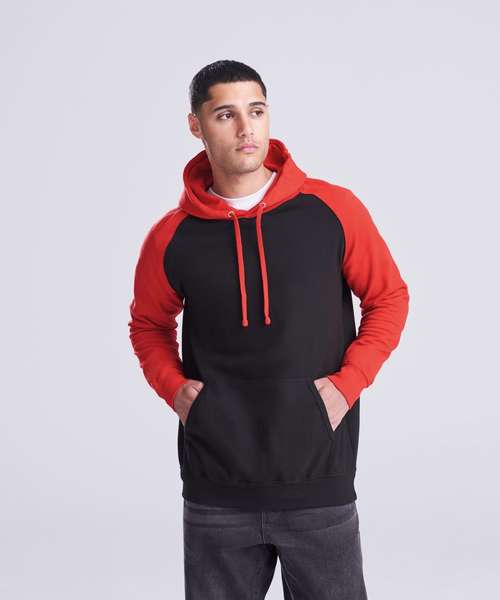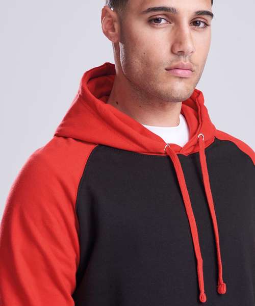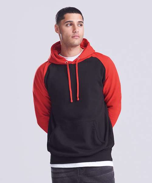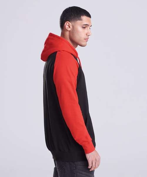 Twin-needle stitching detailing. Contrast raglan sleeves. Double fabric hood. Contrast flat lace drawcord. Kangaroo pouch pocket. Ribbed cuffs and hem. Soft cotton faced fabric creates ideal printing surface. Simple tear out label makes it perfect for rebranding.