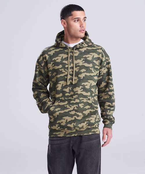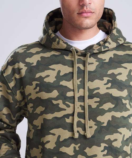 Twin-needle stitching detail. Classic all over camo print. Flat lace drawcords. Double fabric hood. Kangaroo pouch pocket. Ribbed cuffs and hem. Soft cotton faced fabric creates ideal printing surface. Simple tear-out label makes it perfect for rebranding. Flat lace drawcords. Brushed inner fleece.