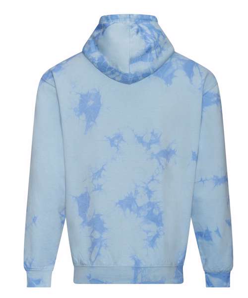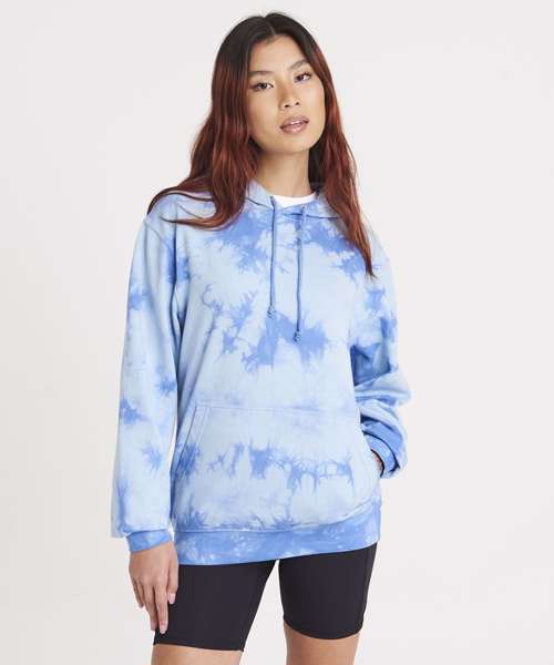 Relaxed fit. Twin-needle stitching detail. Double fabric hood with round drawcords. Kangaroo pouch pocket. Brushed inner fleece. Ribbed cuffs and hem. Tie-dye design. Every piece is unique. Size pip.