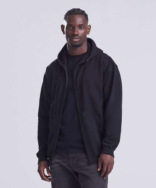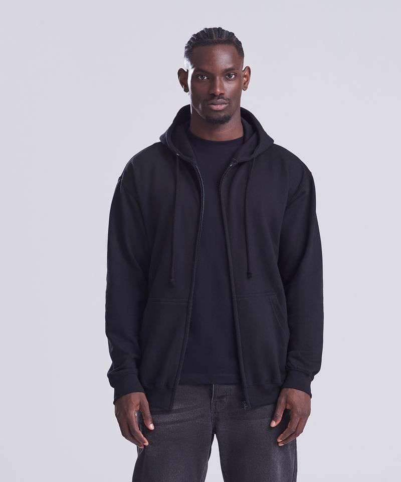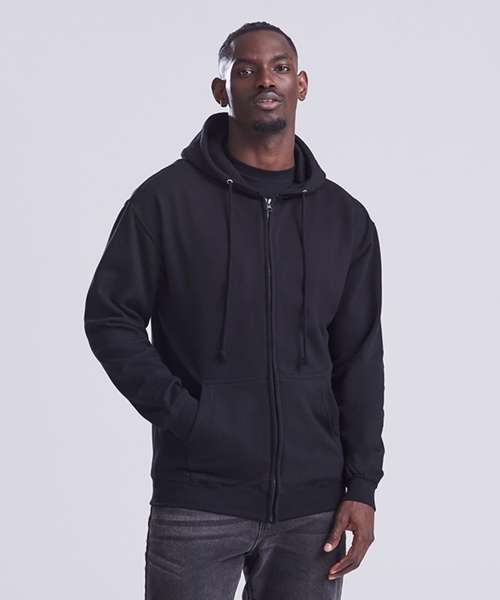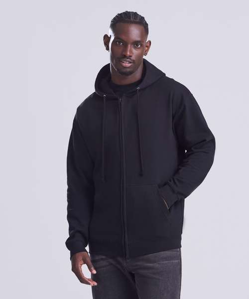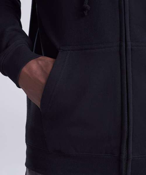 Full zip hoodie with a covered main zip with self fabric. Twin needle stitching detailing and double fabric hood with self coloured cords and kangaroo pouch pocket. Ribbed cuff and hem and self coloured twill tape puller. Soft cotton faced fabric creates ideal printing surface. Simple tear out label makes it perferct for rebranding. Brushed inner fleece.