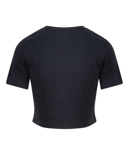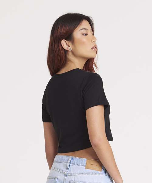 Cropped style T. Short sleeves. Girlie fit. Ribbed crew neck style with taped back neck. Twin-needle stitching detail on sleeve and bottom hem.