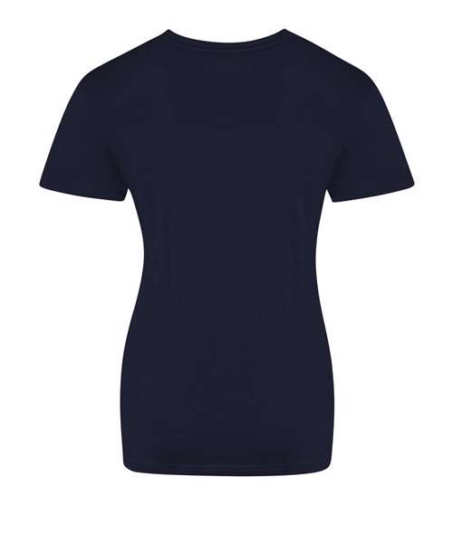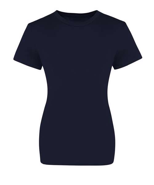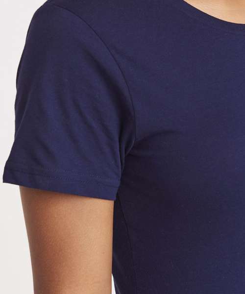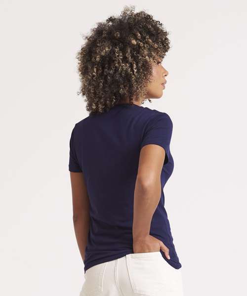 Modern girlie fit. Short sleeves. Side seams. Taped neck. Ribbed crew neck. Twin-needle stitching detail on sleeve and bottom hem. Size label only for easy rebranding - colour coded white for ladies.