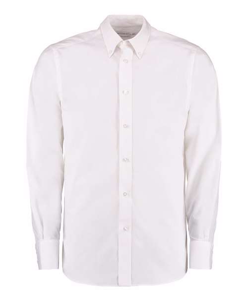 Fused stand-up button-down collar. Single needle stitched yoke and armholes. Double-stitched sleeve and side seams. Two-button cuff with no button pointed cuff placket. Back yoke. Rounded hem. Spare buttons. Kustom Kit® woven back neck label.