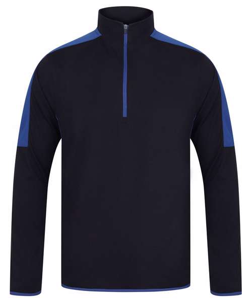 ¼ zip style with stand-up collar. Contrast colour/fabric panels at sides and sleeves. Reversed nylon coil zip with lock down zip slider. Contrast colour stretch binding at cuffs and hem, and concealed pocket in panel seam (right-hand-side as worn). Finden & Hales tear-out label for easy rebranding.