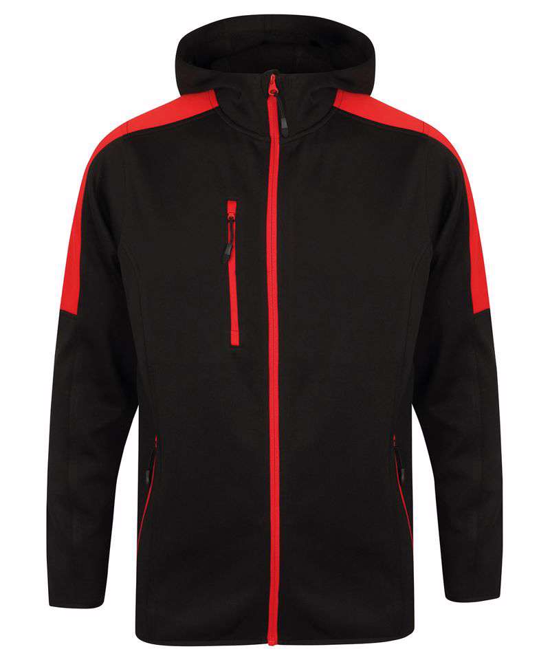 Contemporary softshell jacket with 3 piece hood. Contrast colour panelling on shoulders and upper sleeve. Soft-touch Jersey fabric with bonded microfleece reverse. Zipped chest and side pockets and contrast colour centre front zip with non-slip gripper zip pulls. Side body panels with topstitching. Dropped back hem. Stretch binding at cuffs and hem. Set-in sleeves.