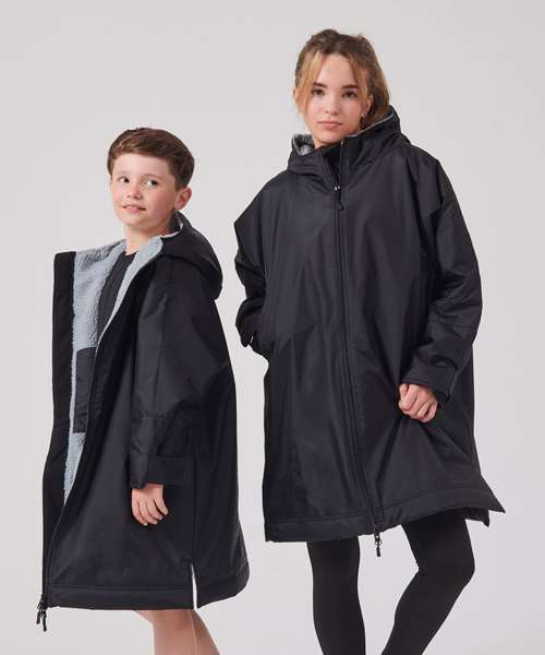 The ultimate team robe is made in a water resistant fabric with a cosy sherpa fleece lining and three-piece hood. The roomy fit with double-ended full front zip allows wearers to keep warm and get changed underneath the robe. Perfect for wild swimming or wearing on team sidelines. Zipped pockets with fleece lining keep hands warm with multiple inner pockets for keeping belongings safe. Topped off with a large embroidery zip for access to directly decorate.