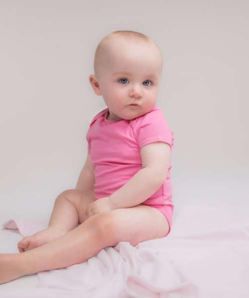 Making a change, this super-soft organic cotton bodysuit has YKK popper fastening on the gusset with self-coloured binding around the envelope neckline.