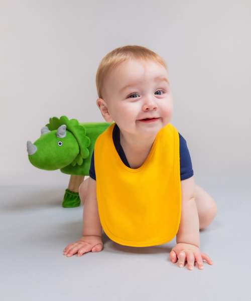 Children's bib with double fabric and binding detail around the edge and hook and loop fastening at the back neck.