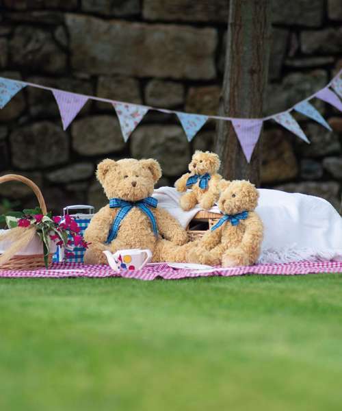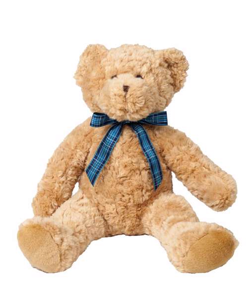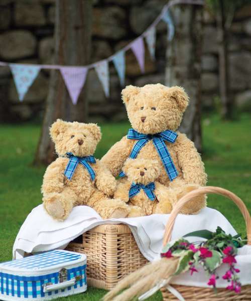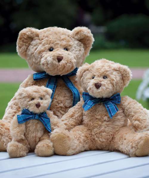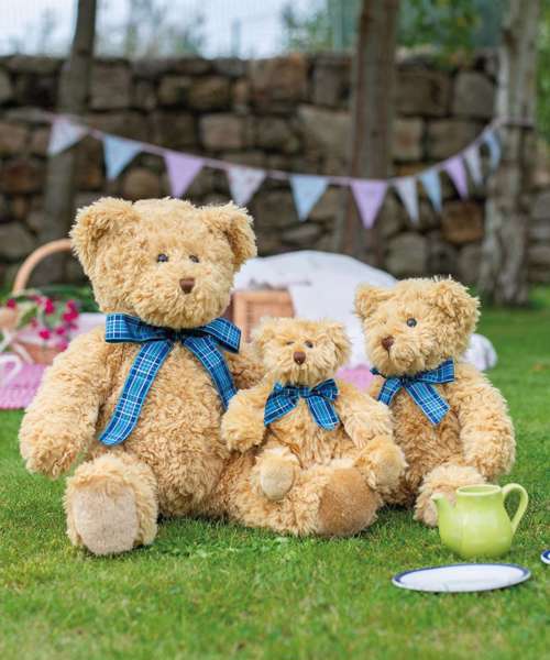 Join the teddy bear's picnic with the Bracken bear, with light brown coloured fur and accessorised with a charming blue tartan ribbon.