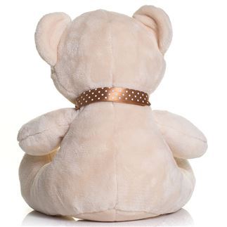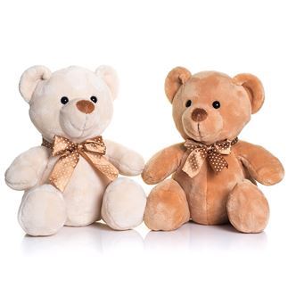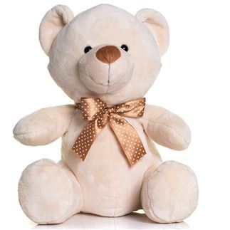 Velvet Bears with a contrast nose. Brown ribbon with cream spots. Suitable for clothing in sizes Small, Medium, and Large. Complies with EN71 European Toy Safety regulations. Remove all hang tags and their fasteners before giving these items to a child. Not suitable for children under the age of 36 months.