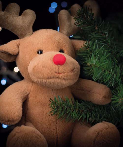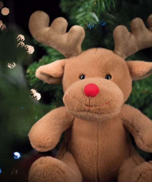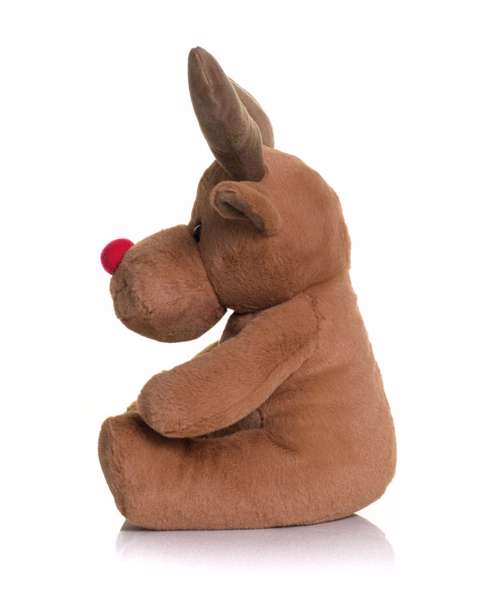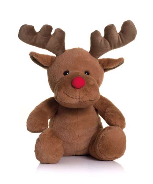 Santa's helper, the Reindeer has soft, brown coloured fabric with a bright red nose and contrast antlers.