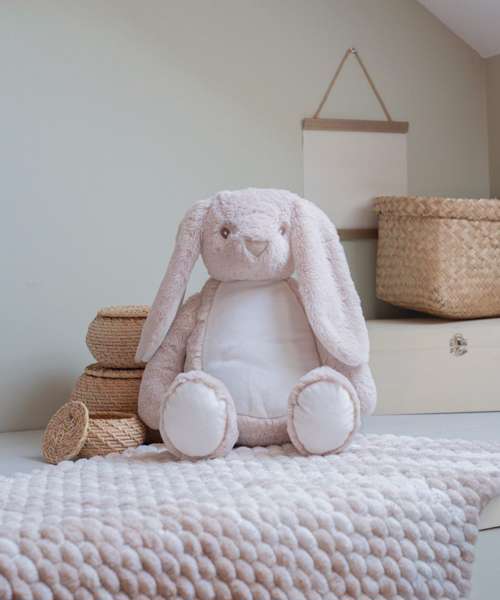 Cream coloured soft plush rabbit. Floppy ears. Contrast pink nose. Sewn eyes. Cream coloured panel on chest and feet. Zip details on the base of the Rabbit for direct access onto the tummy for embroidery. Removable inner stuffing. Complies with EN71 European Toy Safety regulations. Remove all hang tags and their fasteners before giving these items to a child. Suitable for children of all ages.