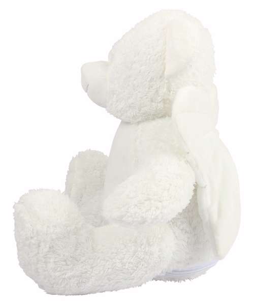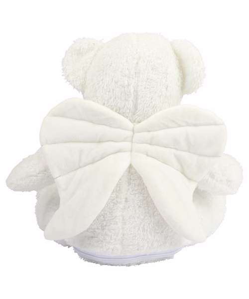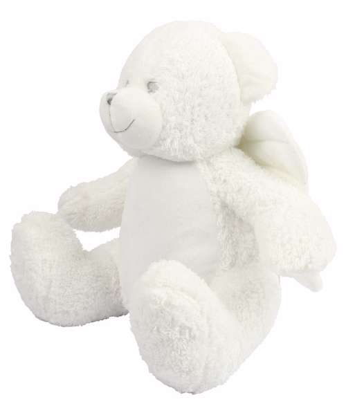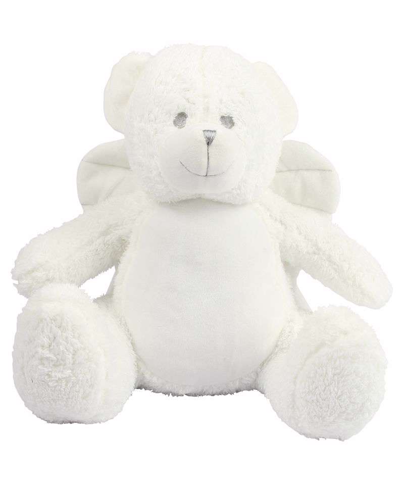 Soft plush angel. Contrast eyes and nose. Cream fabric wings. Cream coloured panel on tummy. Zip access on base for direct access onto the tummy for decoration. Removable inner stuffing. Can be embroidered or sublimation printed. Complies with EN71 European Toy Safety regulations. Remove all hang tags and their fasteners before giving these items to a child. Suitable for children of all ages.