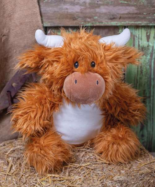 Straight from the hillside - this lovable soft highland cow will be a favourite with all ages. It has sewn eyes and mouth and contrast nose, horns, mane and tail. There is a white panel on tummy which is perfect for embroidery, flock and glitter printing and sublimation. There is also a zip access on base for direct access onto the tummy and a removable inner stuffing. It has been EN71 European Toy Safety regulations tested and it is suitable for all ages from birth upwards.