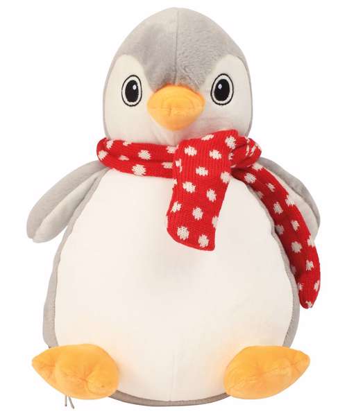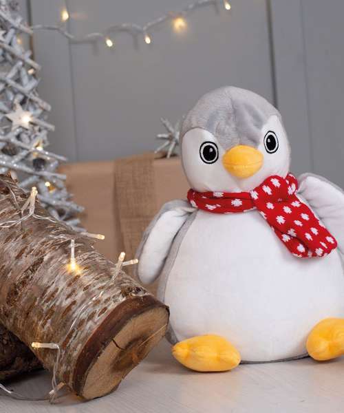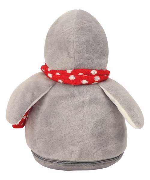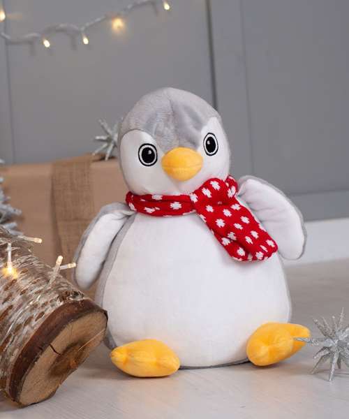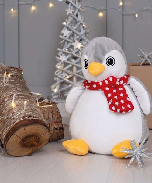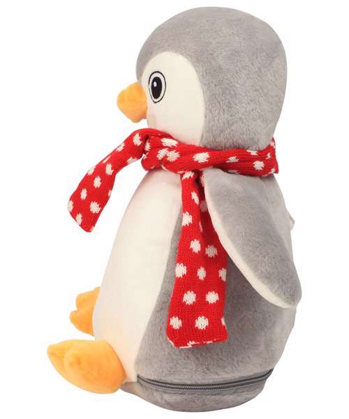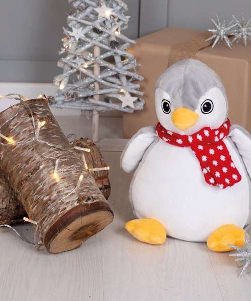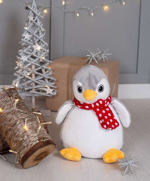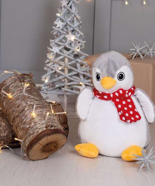 Soft plush grey and white penguin with a contrast knitted scarf. Sewn eyes. Contrast feet and beak. White coloured panel on tummy is perfect for decoration. Zip access on base for direct access onto the tummy for embroidery or print. Removable inner stuffing. Can be embroidered, printed and sublimation printed. Complies with EN71 European Toy Safety regulations. Remove all hang tags and their fasteners before giving these items to a child. Suitable for all ages.