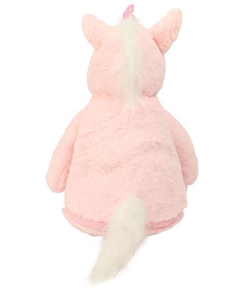 Standing tall with a shimmery pink horn, the fluffy pink mythical creature has contrast shinny paws and a furry tail. A wide tummy area gives plenty space to decorate whimsical statements and names, using the zip around the base of the toy.