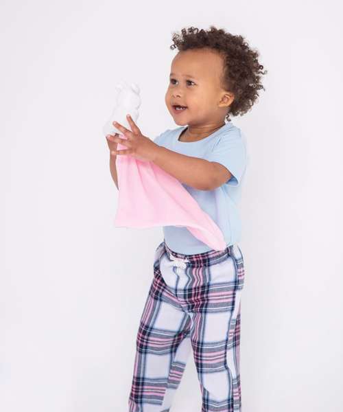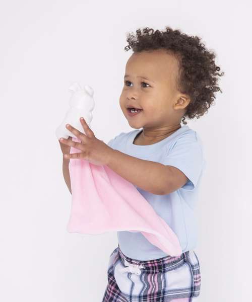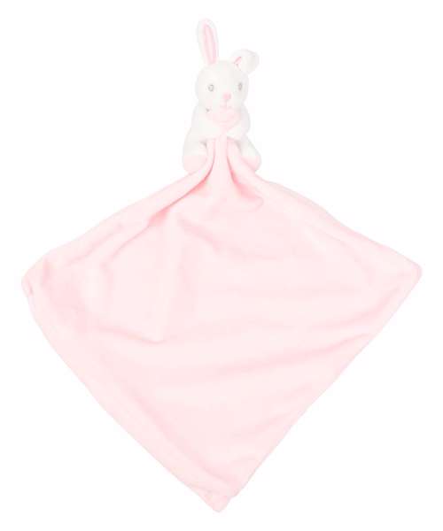 Soft plush rabbit comforter with double-layered blanket and internal rattle. Available in baby pink and baby blue colour options. Zip access allows the blanket to be directly embroidered, vinyl or sublimation printed. Complies with EN71 European Toy Safety regulations. Remove all hang tags and their fasteners before giving these items to a child. Suitable for all ages.