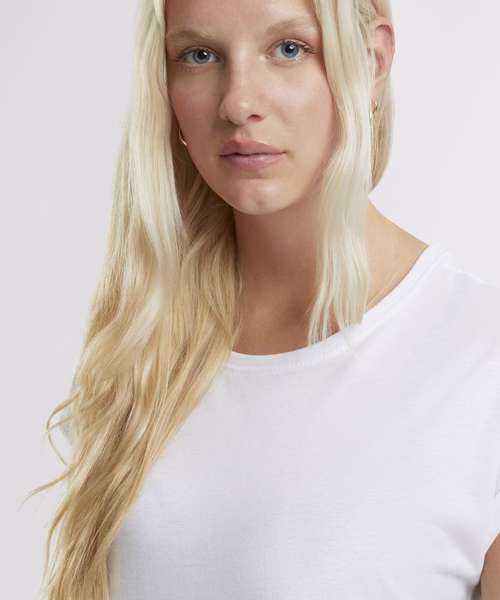 Effortlessly chic with a round neckline. Comfortable loose fit for everyday wear. Classic short sleeves, perfect for layering. Timeless design with a seamless collar. Simple elegance in a plain pattern. 100% Certified organic cotton.