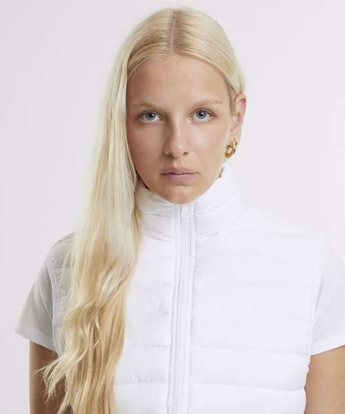 Lightweight design for effortless layering. Features a sleek stand collar style. Regular fit ensures a comfortable wear. Timeless, sleeveless silhouette for versatility. Simple, solid pattern for classic appeal. 100% Certified recycled polyester.