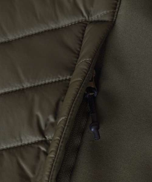 Outer fabric: 100% Recycled nylon - 95% Recycled softshell, 5% Elastane. Padding: 100% Polyester; Sorona® Aura