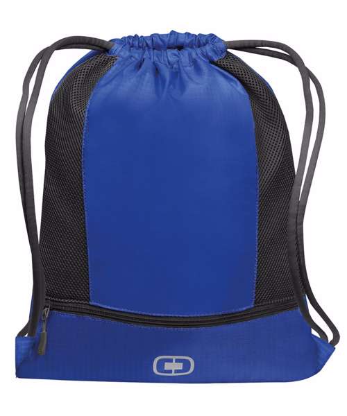 Easy access front storage pocket. Side water bottle stretch mesh pocket. Side stash valuables pocket. Stretch mesh phone pocket on shoulder strap. Carryall with drawstring top. Sling style, padded shoulder strap.