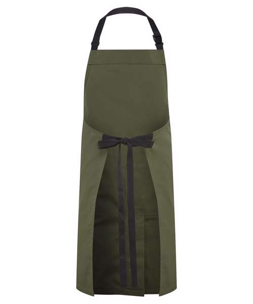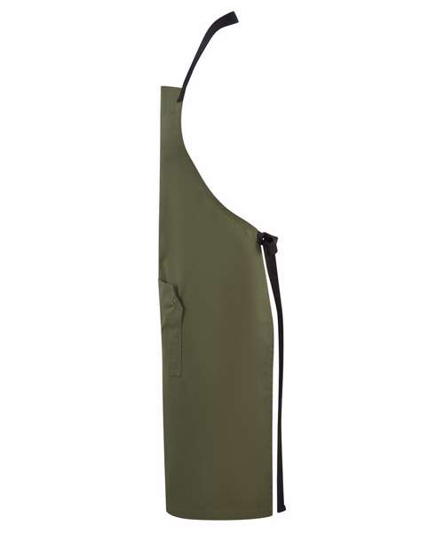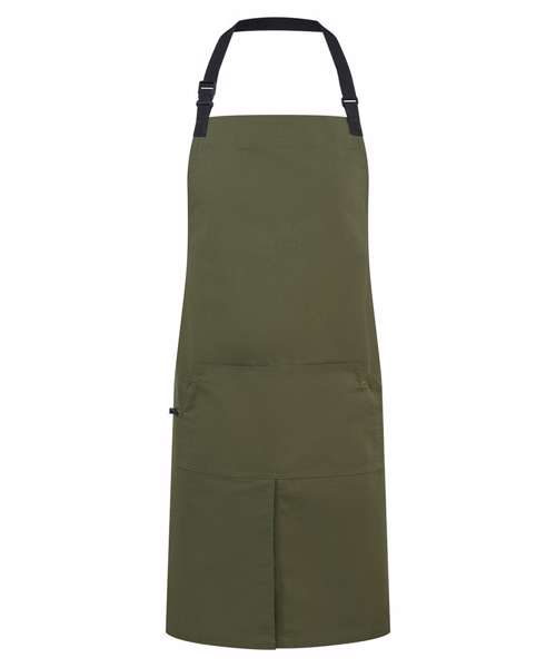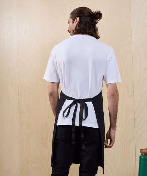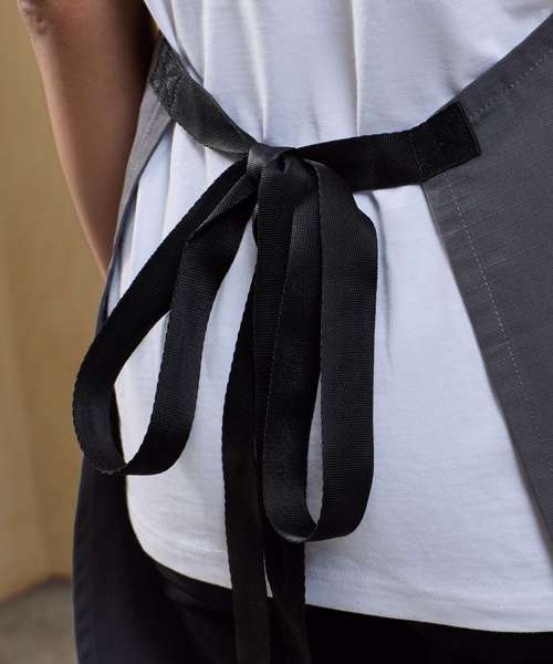 Full bib apron with woven ripstop fabric for strength and durability. Adjustable seatbelt-style neck strap with a clip fastening buckle. Seabelt-style waist ties. Centre pocket with press stud buttons to release extra pocket space. Fabric tab off the centre pocket. Centre split for ease of movement. 86cm long x 72cm wide. 90cm straps. Contains certified recycled polyester. Washable to 60°C.