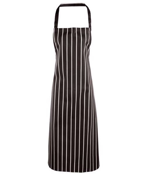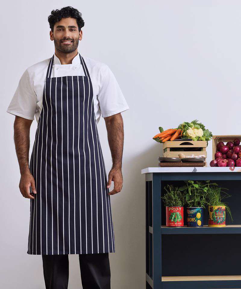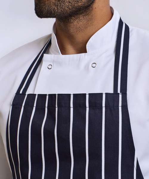 A favoured style with the more traditional occupations in the industry, this 'Butcher's' bib apron offers great protection for the wearer and is embellished with vertical stripes. The striped pattern continues across the neckband and ties.