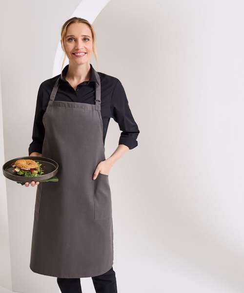 A heavyweight full length bib apron made from a combination of certified recycled polyester and certified organic Fairtrade cotton. Featuring two slanted side pockets and fully height adjustable with a buckle on the neckband. Two slanted side pockets measuring 24cm depth by 18cm wide. Adjustable buckle with gun metal finish. 86cm long x 72cm wide with 90cm long ties.