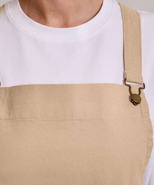 Self-fabric ties that are fastened to the main body of the apron with dungaree style buckles. The straps then hook over the shoulders, cross over at the back, loop through the large eyelets at the waist and tie neatly at the back. Also features a useful front centre pocket with combined pen slot. This style is designed to be paired with our PR119 Interchangeable apron straps should you want a contrast colour or fabric to the main body of the apron.