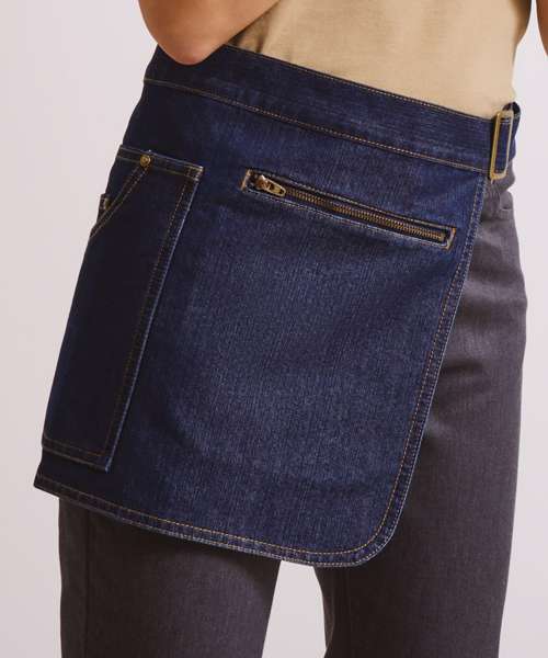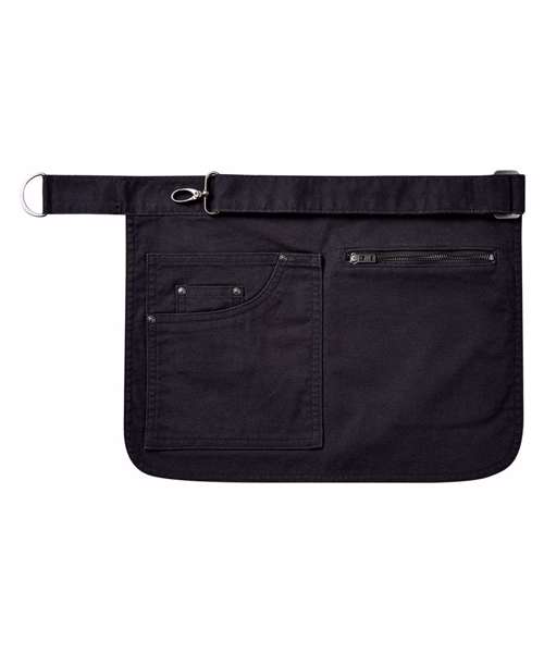 Hip apron with adjustable self-fabric waistband. D-ring and carabiner fastenings. Jeans style stitched pockets. Zipped pocket.