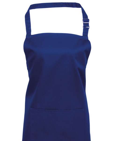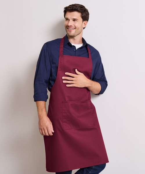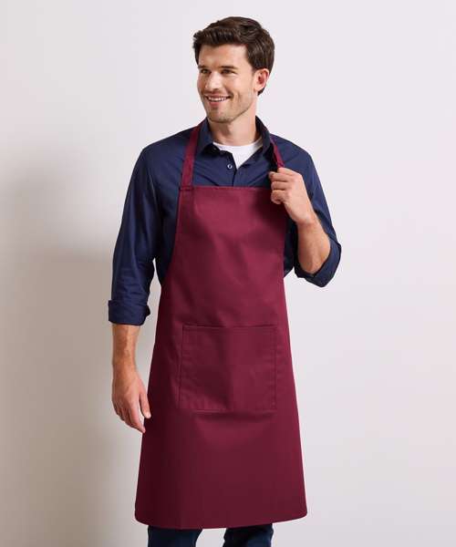 A classic bib apron that features a centre pocket with built in pen pocket. From the Premier 'Colours' collection, this apron has a sliding adjustable buckle on the neckband so the wearer can adjust the overall length.