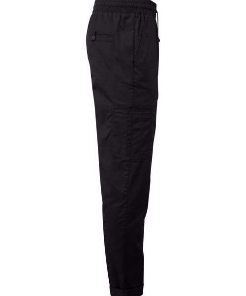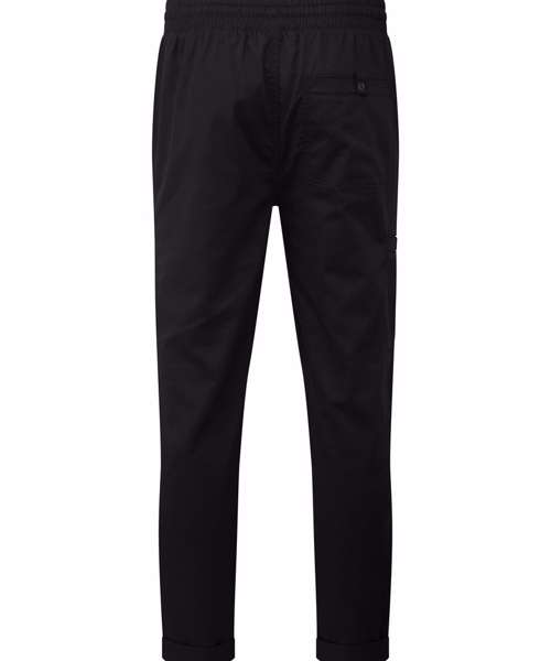 Lightweight chef’s cargo trousers made with certified recycled polyester. Elasticated waistband and drawcord. Mock stitched fly. Two side swing pockets. Welt pocket to the upper right leg with combined pen pocket. Single welt pocket to the reverse with press stud tab for fastening. A tapered fit to the lower leg with optional turn-up hem for styling.
