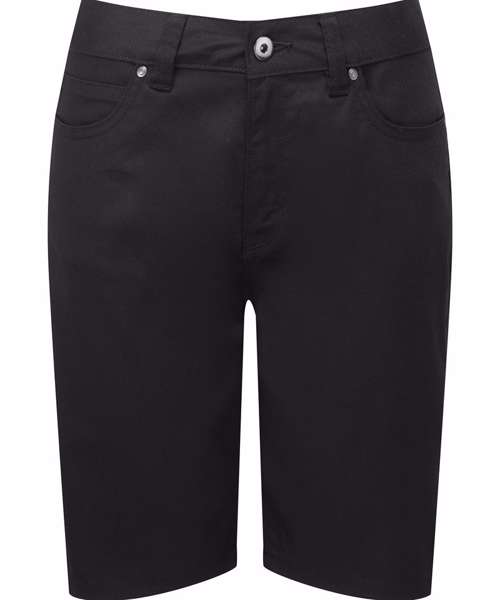 Women’s chino shorts with a touch of elastane for comfortable stretch performance. To the waistband there are loops to facilitate a belt, a metal button and a hook and bar for secure fastening. Covered YKK zip fly and side pockets with rivet detail for a typical ‘chino’ look. Two patch pockets to the reverse. Finished with a double turned hem.
