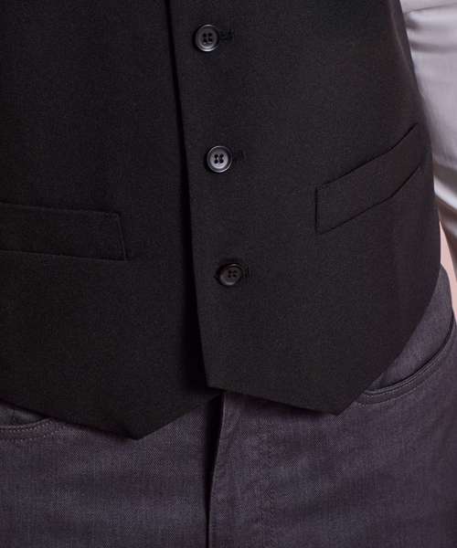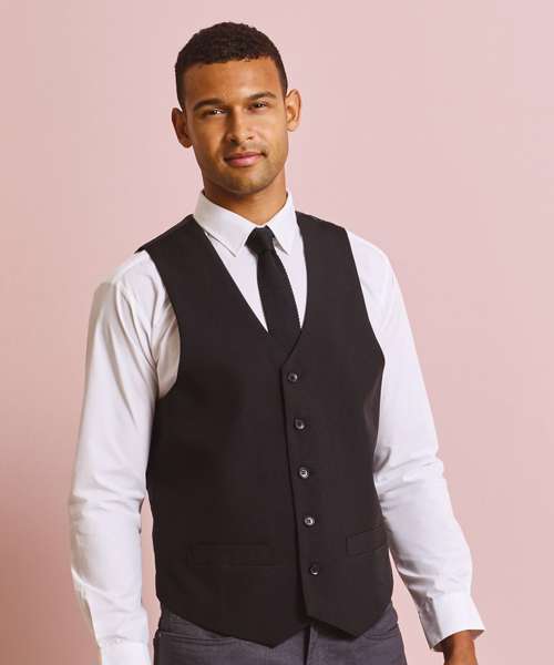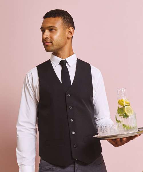 A men's waistcoat with five buttons and two functional watch pockets makes for a really stylish piece of hospitalitywear. This waistcoat is fully lined and comes with a satin back where there is a buckle adjuster to for a more fitted appearance.