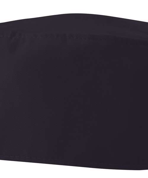 One size fits all. Flat top chef's skull cap. Elasticated back, crease resistant finish.