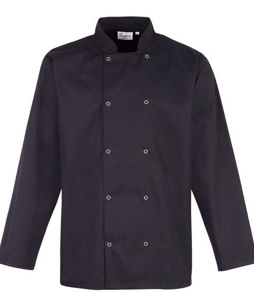 This long sleeve jacket fastens with pop studs for an easy-wearing jacket for chefs. The unisex styling and soft hand feel makes this style a popular choice for kitchen staff.