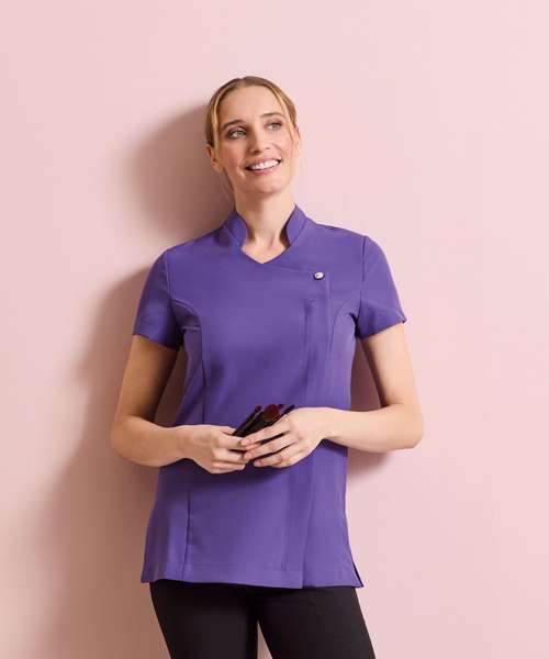 Beauty and spa tunic with feature button front fastening with concealed zip. Mandarin collar. Short sleeve. Princess seams. Side vents. Back pleat for ease of movement. Easycare.