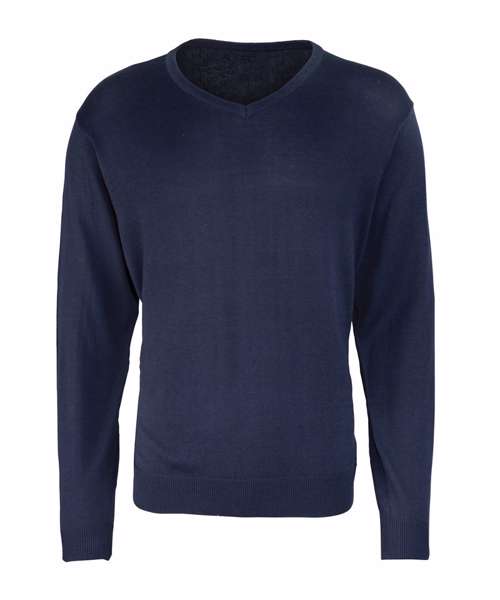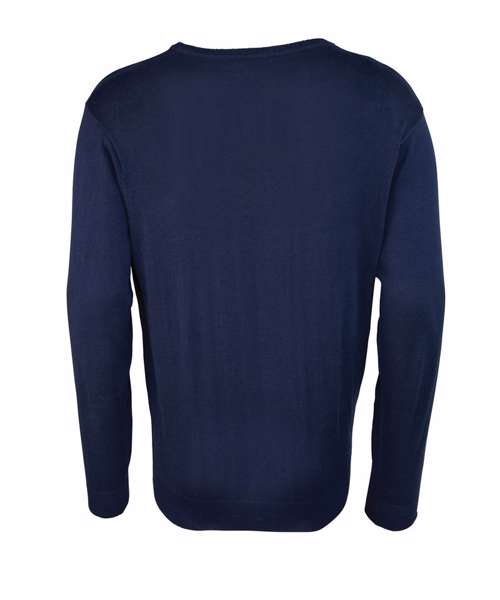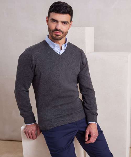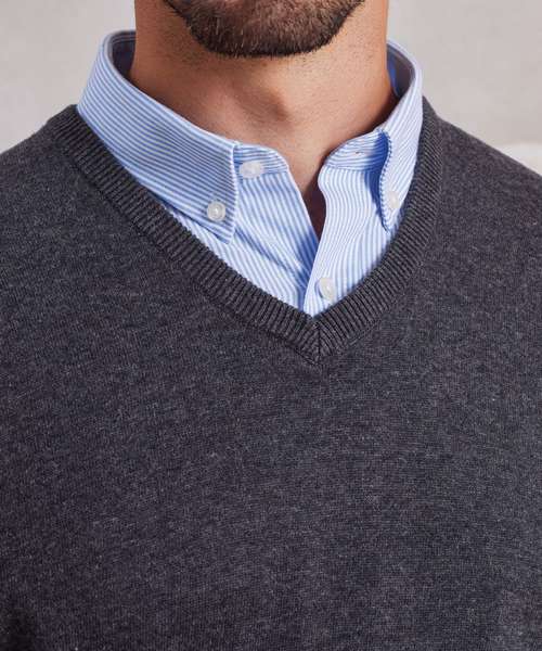 Men's long sleeve v-neck sweater. Soft feel/cotton rich yarn. Ideal for wearing with or without a tie. Fine gauge knit. Contemporary styling. Set in sleeves.