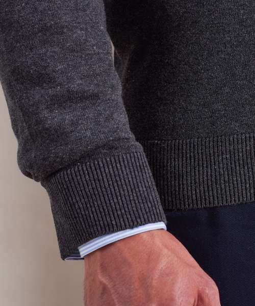 A V-neck long sleeve men's sweater made with a fine gauge knitted cotton rich yarn for a soft and comfortable feel. The set in sleeves and hem give a contemporary feel to the jumper making this a great piece to layer up over a shirt.