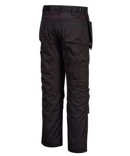 A durable polyester/cotton blend fabric allows for high-performance maximum range working, as well as comfort. Stretch panelling offers easy movement. Clever features include multifunctional holster pockets, top-loading kneepad pockets and an easy access multi-way thigh pocket for secure storage of phone, keys and tools.