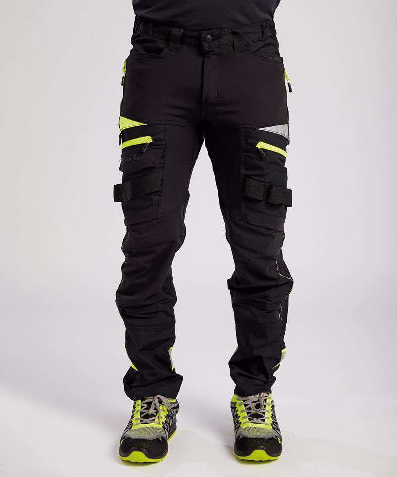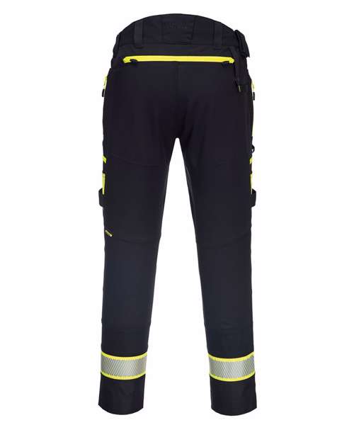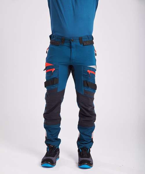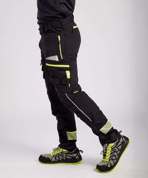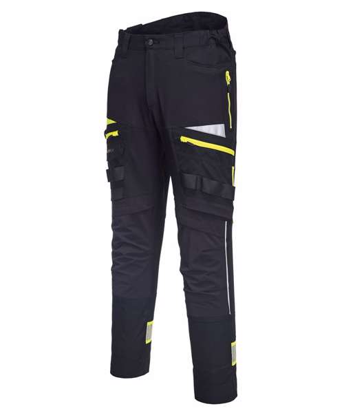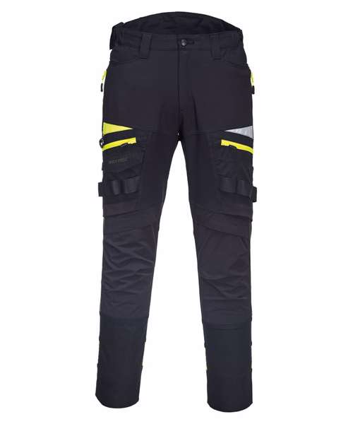 Four-way stretch fabric for ease of movement and added comfort. High-rise back waistband ensures protection in all working positions. Reflective trim for increased visibility and safety. Two-tier kneepad pockets allow two positioning options. Easy grip pullers are attached to all zips. Multiple side zip compartments for secure storage. 11 pockets for ample storage. Two side pockets. Two side zip pockets for secure storage. One phone pocket. Two back zip pockets. One welt pocket. CorePro reinforced thigh pocket. Hammer loop for secure storage of work tools. Side elastic waist for ultimate wearer comfort. Pre-bent knees allow for increased freedom of movement. Crotch gusset to reduce stress and prevent seam failure. Zip fly with Portwest branded stud button. Slim fit design for exceptional comfort. Bartacked at all stress points. Triple-stitched seams for extra durability. 40+ UPF rated fabric to block 98% of UV rays. Extendable leg length (31" to 33").