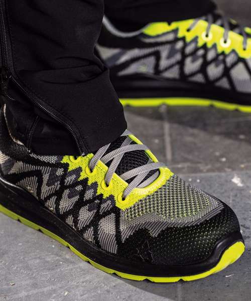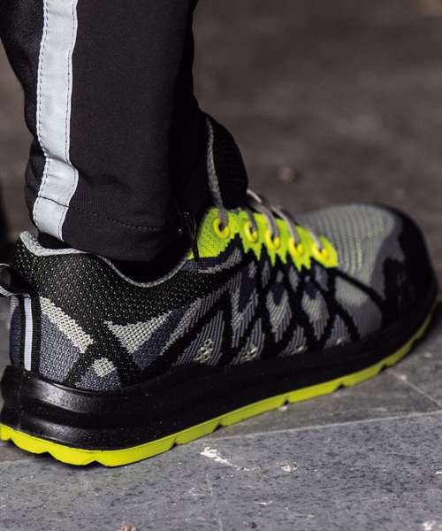 This safety trainer offers a recycled knitted upper. Designed for maximum safety, comfort and performance, the lightweight stylish construction features a super comfort gel footbed.