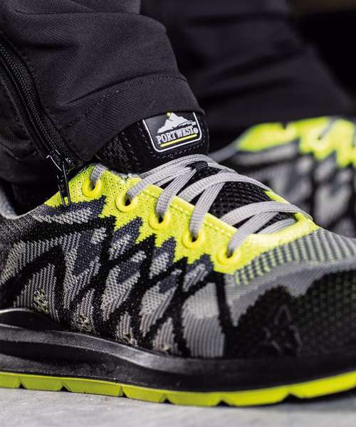 Material Upper: Technical textile. Material Outsole: PU/PU. PET plastic recycled knitted upper. 100% non-metallic. Portwest Compositelite footwear contains non metallic protective fibreglass toecaps and/or non metallic protective midsoles