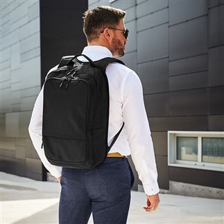 TearAway label for ease of rebranding. Water-repellent, abrasion resistant fabric. Minimalist design with adaptable functionality. Laptop compatible up to 15.6". External access secure padded laptop compartment. Zippered front compartments for flexible organisation. Full HD Polyester lining. Internal elastic bottle holder. Expandable capacity from 20-25 litres. Breathable padded mesh back panel. High density seatbelt webbing. Reach certified.