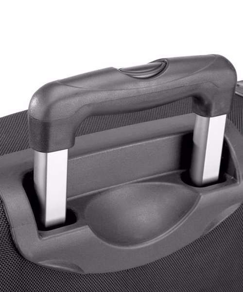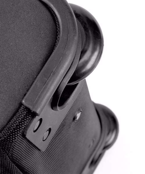 Zippered side pocket, multiple internal pockets. Detachable adjustable shoulder strap with pad. Haul handle. Padded hand grip. Retractable twin tube locking tow handle. Durable integrated skate wheels. Zippered front pocket. Padded handles. Covered name card holder.