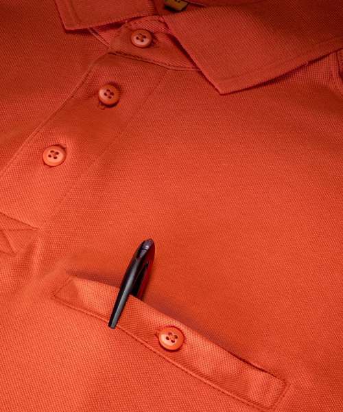 Overlocked polyfilm seams for shape retention. Double layer shoulder panels. Critical twin needle stitching. Locker patch for self brand. 3 button reinforced placket and side vents. Welt chest pocket with button fastening. Raised edge flat-knit rib collar and cuff. Drop sleeve. Spare button. Collar stand. Ready to brand – tag free. Easy to wash, tough and hardwearing. Soft piquet knit.