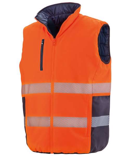 EN ISO 20471:2013+A1:2016 CLASS 2; RIS-3279-TOM (ORANGE ONLY). Lightweight and warm. Soft stretch. Printable. High visibility. Reflective safety body bands. Hang tag. Dark lower panel masks grime. Soft bound cuff. Stand-up collar. Quiet to wear. Zipped pockets. Ready to brand tag free. Decorating methods: Embroidery. Decorators access point: Hidden chest and back zips on navy side.