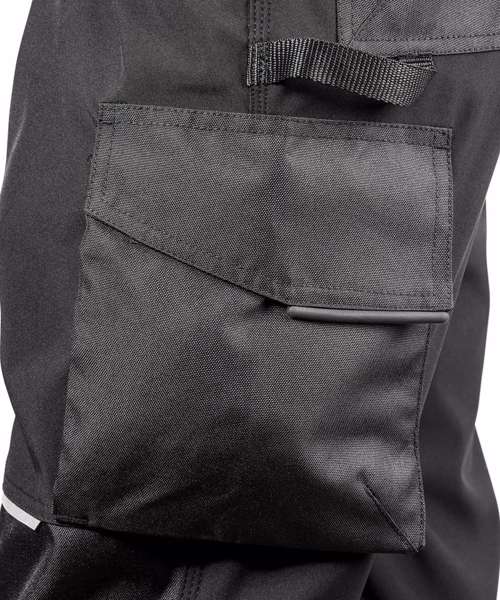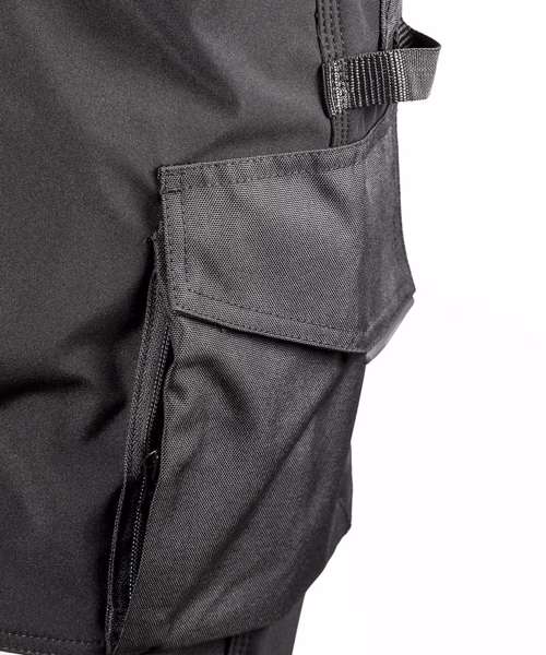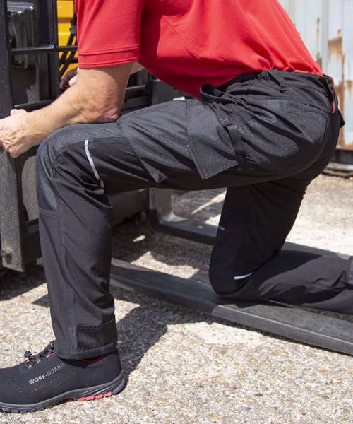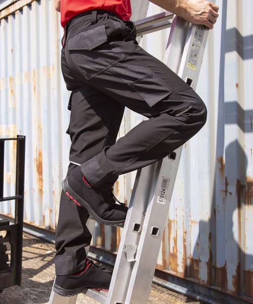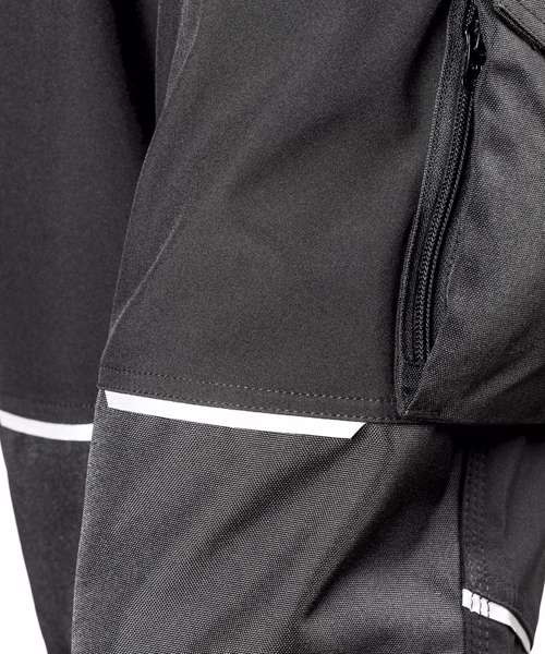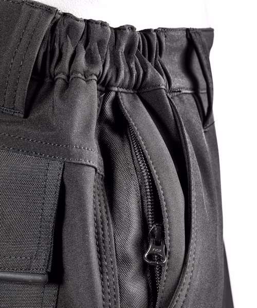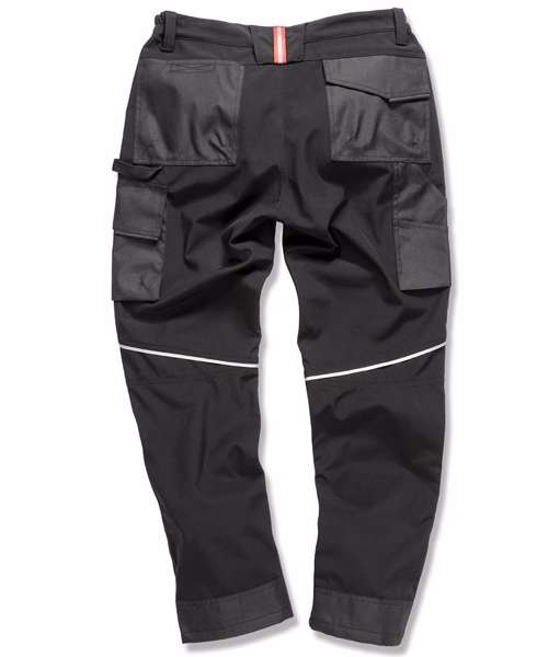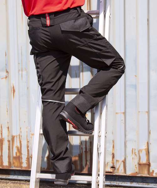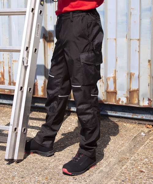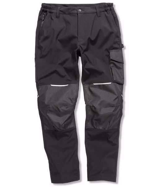 Multi-use cargo thigh pocket with zip. Tough, articulated knee panels. Rubber tear release pocket strip. Critical stress point bar tacking. YKK zip with button fastening. Toughened ankle scuff panel. Triple needle stitched seams. Hand warmer side pockets. Expandable waistband. Reflective detailing. Rear pockets. Hammer loop. Rule pocket. Belt loops. Durable water-repellent finish 3-layer bonded mechanical softshell comprising: outer layer - 100% Polyester; mid-layer - waterproof 8000mm, breathable 3000mvp and windproof TPU membrane; inner-layer - 100% Polyester. Knee panels: PU coated Oxford polyester.