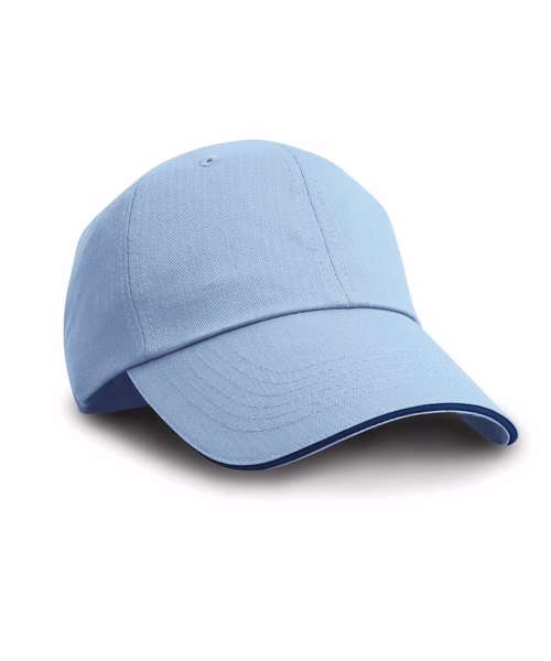 Herringbone weave. 6 panel. Low profile. Unsupported front panels. Pre-curved peak with 6 stitch lines. Contrasting colour sandwich peak. Stitched eyelets. Fabric size adjuster with antique brass buckle. Decoration Guidelines: Decorating methods: Embroidery & Transfer print Decorators access point: Open.