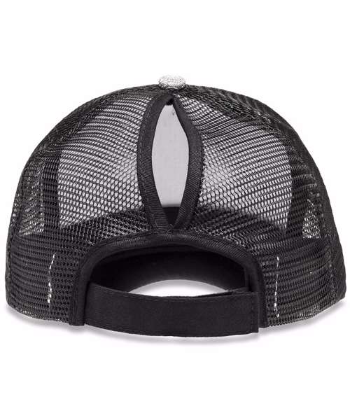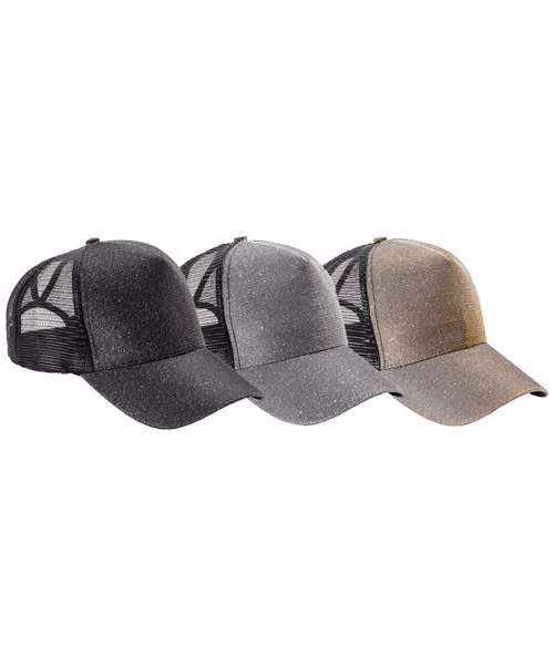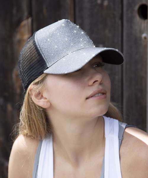 5-panel cap (4 mesh/1 fabric). Sparkle fabric stiffened front panel and peak. Mesh back with ponytail hole. Tear-release adjuster. Semi-curved fabric peak made from recycled plastic. Tear-away label.